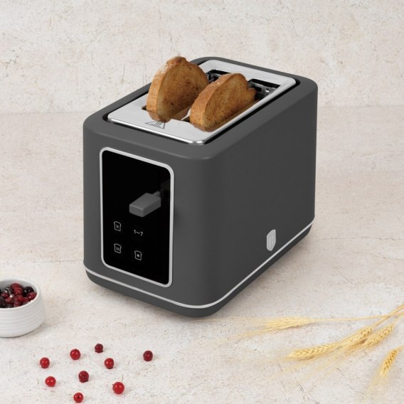 Elegancki cyfrowy toster w kolorze szarego matu to połączenie nowoczesnego designu i funkcjonalności, który doskonale uzupełni każdą kuchnię.